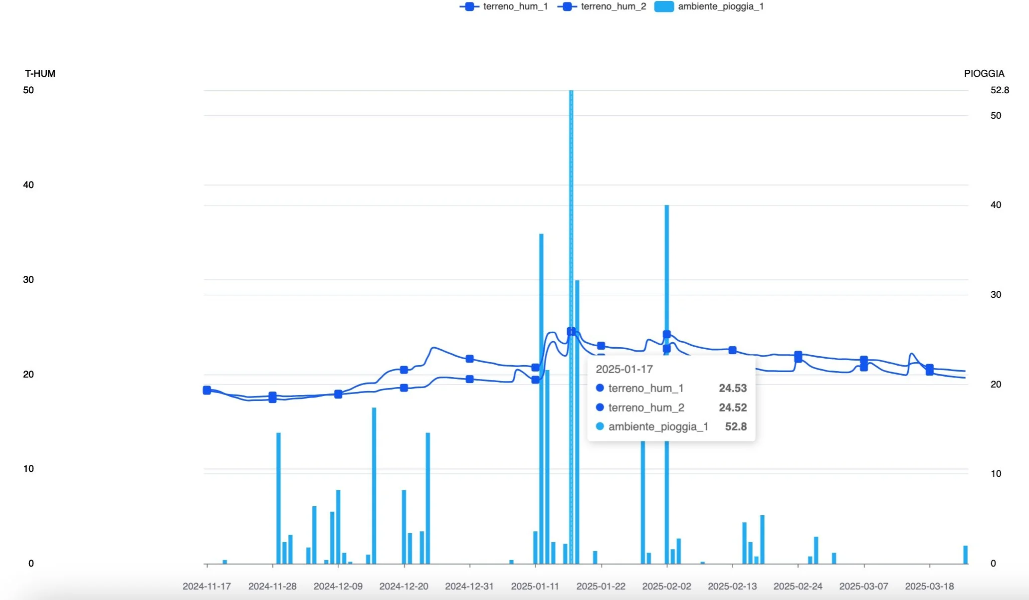 La dashboard e i grafici consentono di monitorare in tempo reale la quantità di acqua presente nel terreno e confrontarla con le soglie di irrigazione ideale che sono state fissate.