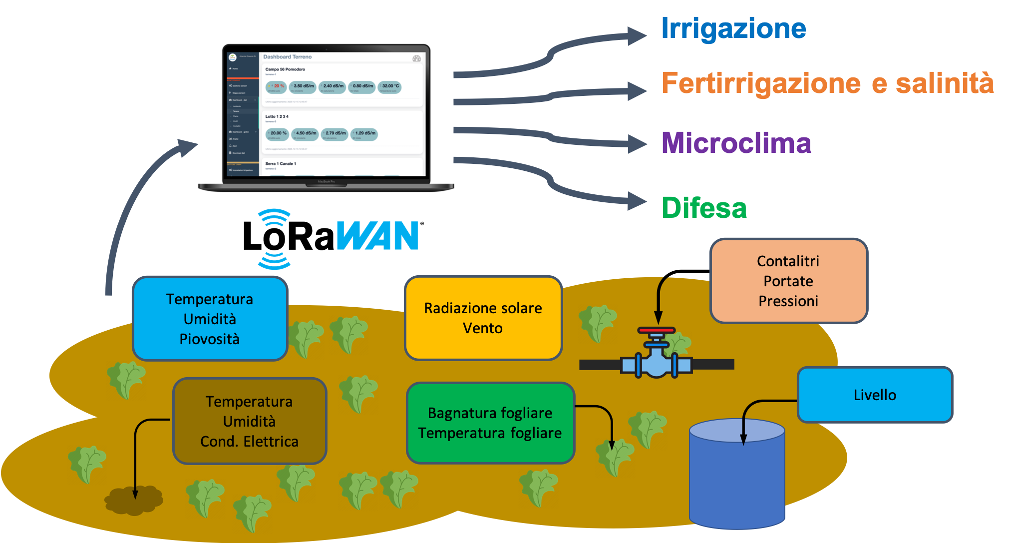 Le soluzioni di TerraSmart per il campo aperto utilizzano sensori avanzati per rilevare parametri come umidità e conducibilità elettrica del suolo, piovosità, radiazione solare, bagnatura e temperatura fogliare.